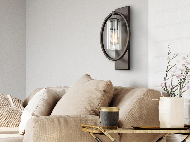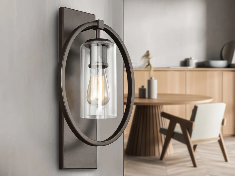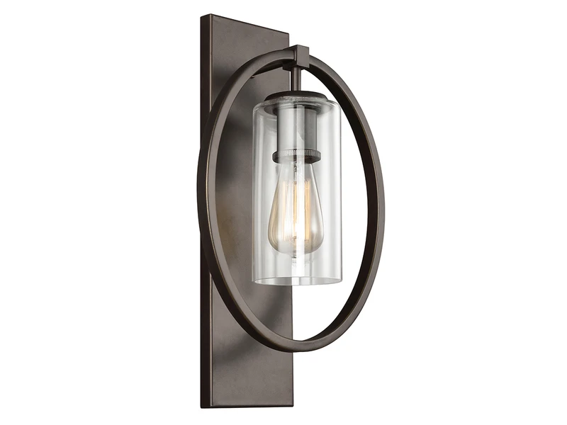 Der Korpus der Wandleuchte besteht aus bronzefarbigem solidem Stahl. Der äußere Ring umrahmt elegant den Lampenschirm aus Glas. Der Material Mix aus massivem Stahl mit dem Lampenschirm aus Klarglas verleiht der Wandleuchte einen Hauch von Industrial Style.