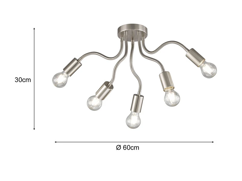 Die Deckenlampe hat eine Höhe von 30 cm und einen Durchmesser von 60 cm. Dank der zeitlosen Farbgestaltung in Nickelfarben matt bieten sich zahlreiche Kombinationsmöglichkeiten an.