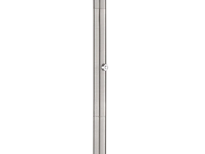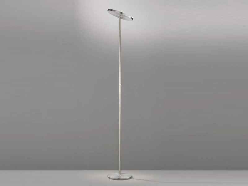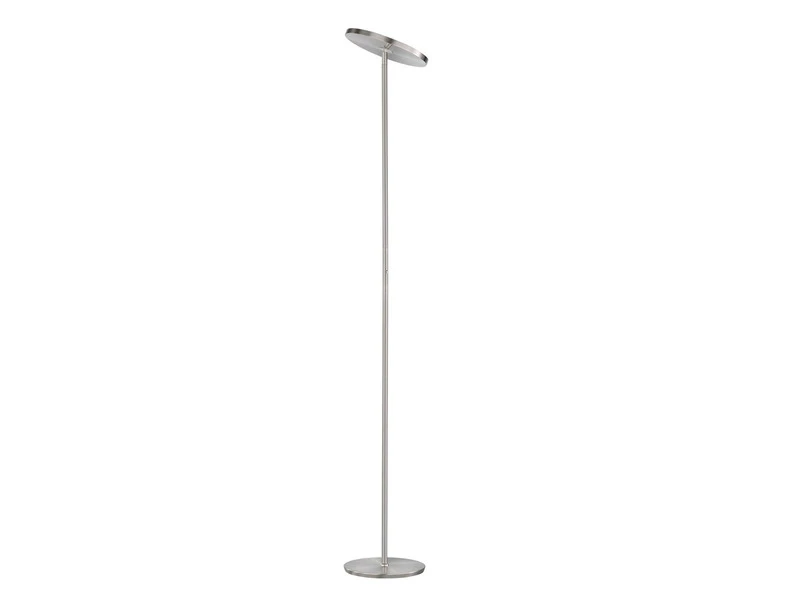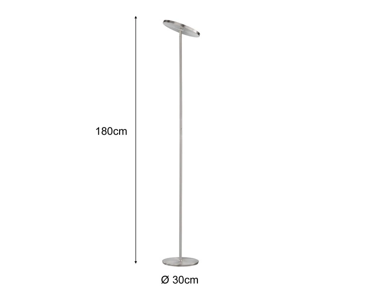 Die moderne Standleuchte hat einen Höhe von 180 cm und einen Durchmesser von 30 cm. Der Korpus ist aus Metall in Nickelfarben matt und Chromfarben gefertigt, an der schwenkbaren Brennstelle des Fluters sorgt eine weiß satinierte Acrylglasabdeckung für ein angenehmes und blendfreies Licht.
