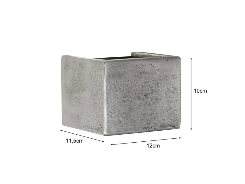 Die kleine, würfelförmige Wandleuchte hat eine Wandausladung von 11,5cm. Der Metallkorpus in Silberfarben Antik hat eine Breite von 12cm und eine Höhe von 10cm.