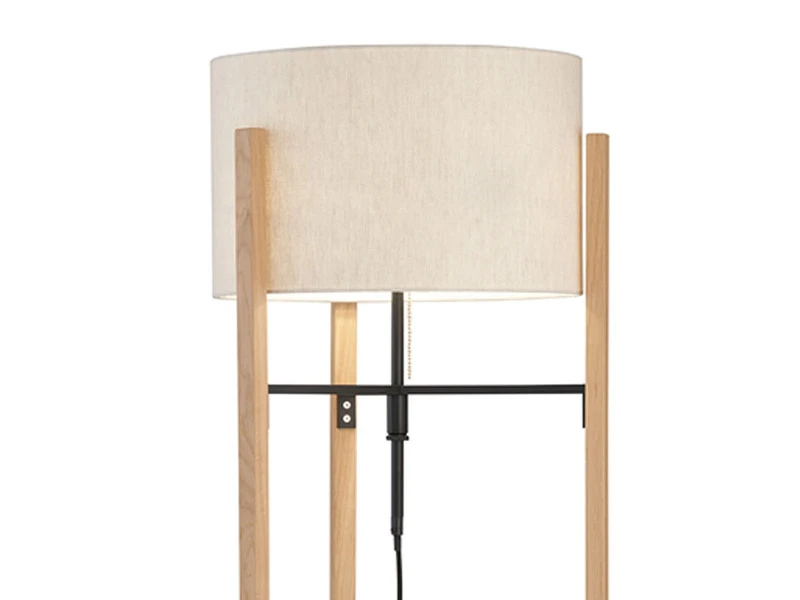 Der hochwertige Lampenschirm ist aus sandfarben beigem Leinenstoff (innen Weiß) gefertigt und hat einen Durchmesser von 38cm. Er steht in perfekter Symbiose mit dem Holzgestell aus geölter Eiche und matt schwarzem Metall.