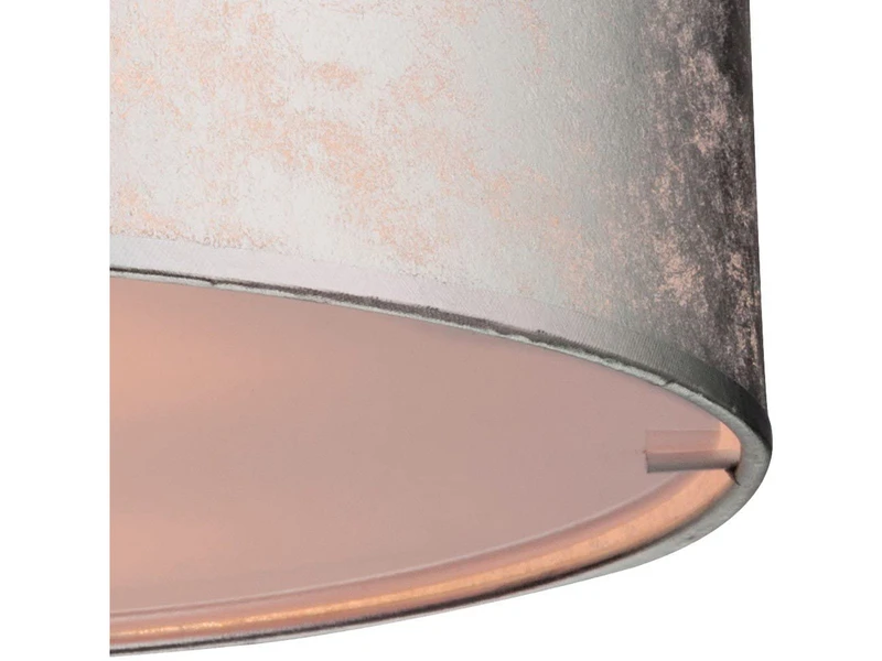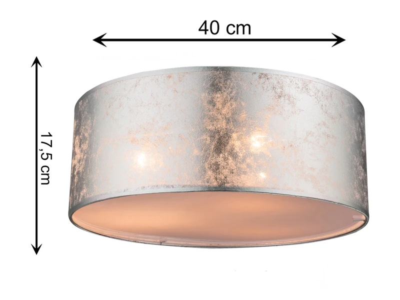 Der silberfarbig marmorierte Stoffschirm hat einen Durchmesser von 40cm sowie eine Höhe von 15 cm. Das stilechte Erscheinungsbild der Deckenleuchte sorgt im Zusammenspiel mit der unteren satinierten Acrylabdeckung für eine blendfreie angenehme Beleuchtung. Bei Verwendung von entsprechend warmweißen Leuchtmitteln zaubert die Deckenlampe ein besonders wohnliches Licht.