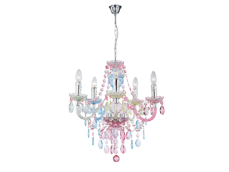 Der verchromte Luster zeichnet sich durch seine filigrane Arbeit aus und gemeinsam mit den bunten Acrylkristallen wird er zu einem richtigen Blickfang.
