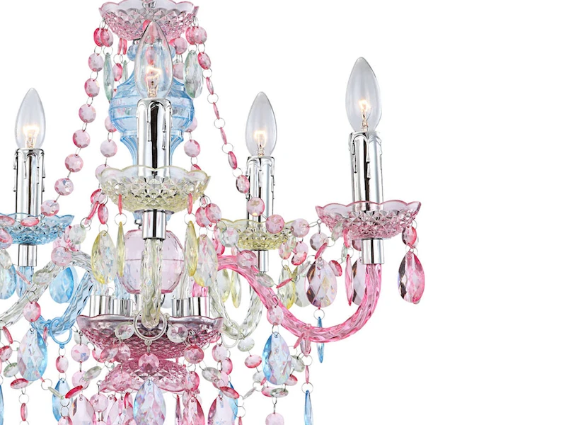 Der verchromte Luster zeichnet sich durch seine filigrane Arbeit aus und gemeinsam mit den bunten Acrylkristallen wird er zu einem richtigen Blickfang.