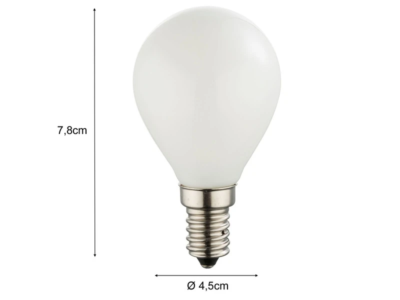 Die Glühlampe ist extern über Ihre Hausinstallation dimmbar, hat einen Durchmesser von 4,5 cm, eine Länge von 7,8 cm und ist passend für alle Leuchten mit einer E14 ILLU Fassung.