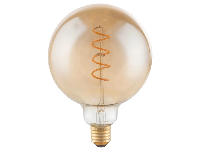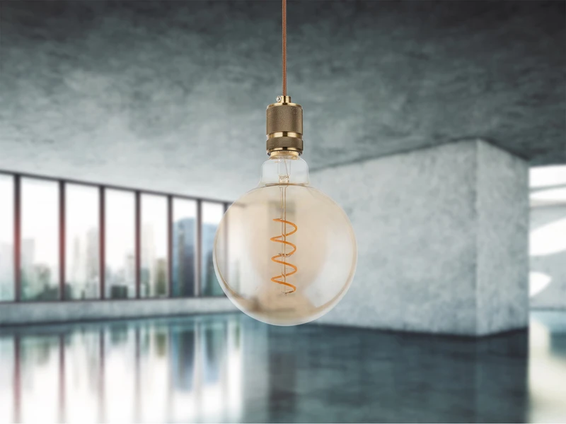 Mit seinem kugelförmigen Korpus aus amberfarbenem Glas und dem messingfarbenen Sockel verleiht das Filament Leuchtmittel jeder Leuchte den ultimativen Glow.