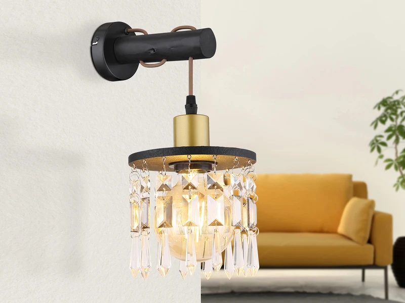 Der an einem schwarzen Holzelement befestigte Lampenschirm mit einem Durchmesser von 15cm besteht aus einem rauchfarbigen Kristallbehang und zaubert glanzvolle Lichtspiele in Ihre Wohnräume.