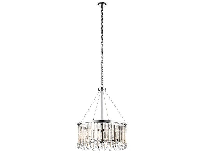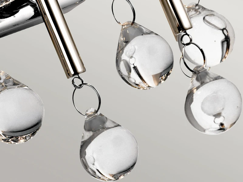 Der große runde Lampenschirm ist bestückt mit Echtglaselementen, die für faszinierende Lichtspiele sorgen. Das solide Metallgestell ist in Silber Chrom lackiert und rundet das luxuriöse Erscheinungsbild dieser Designerleuchte ab, die ein absoluter Eyecatcher in jedem Innenbereich ist.