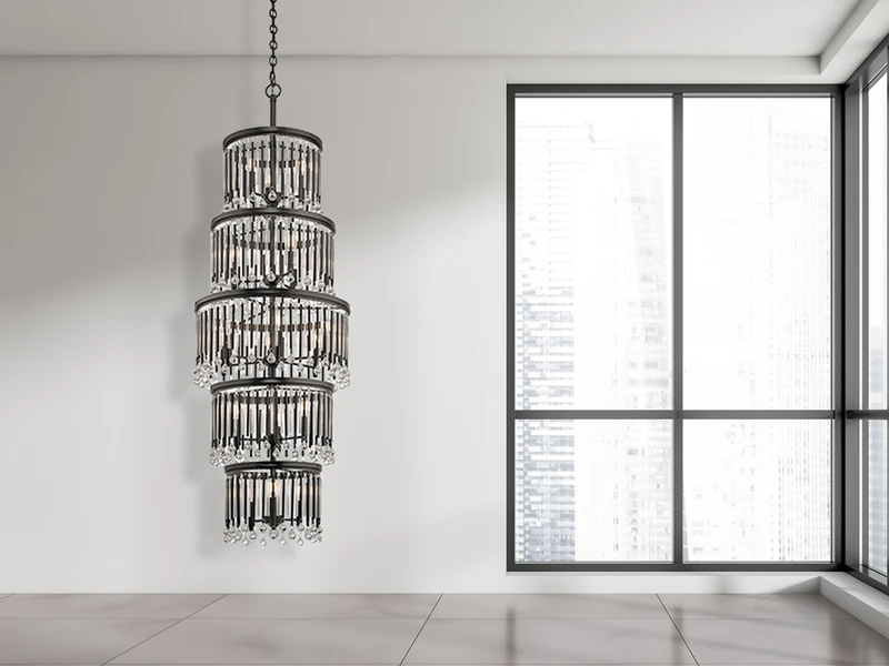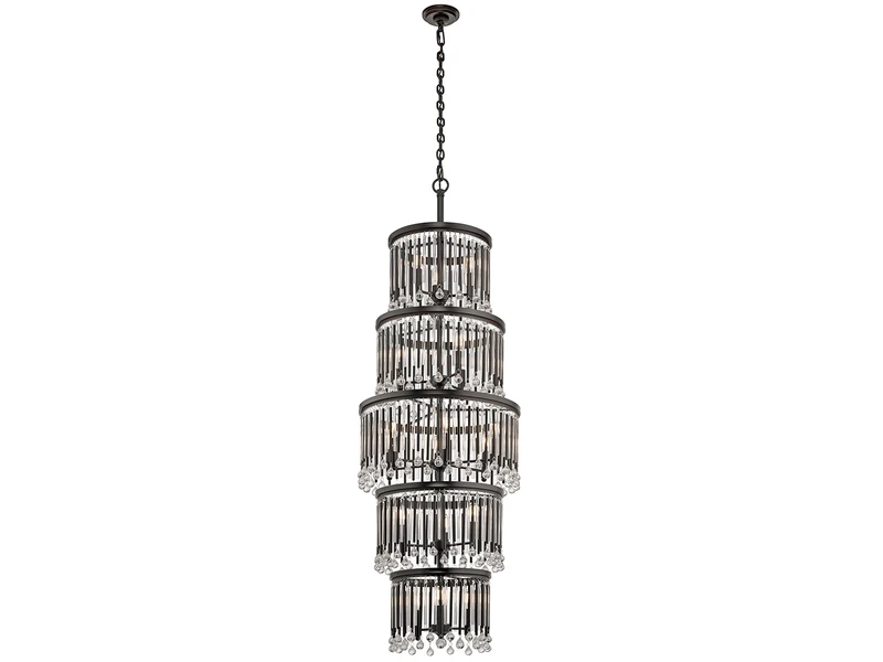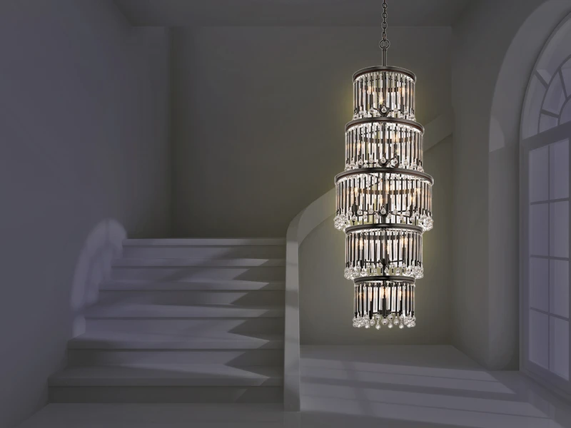 Die fünf unterschiedlich großen Ebenen des edlen Deckenlüsters erinnern an Kaskaden und sind bestückt mit Echtglaselementen, die für faszinierene Lichtspiele sorgen.