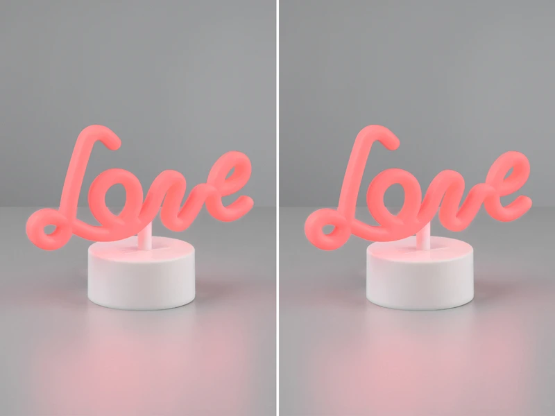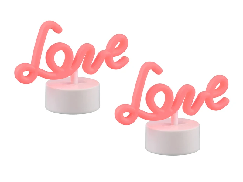 Das fest verbaute LED je Leuchte hat eine Leistung von 1 Watt lässt den Schriftzug in der Farbe Pink leuchten. Über den AN-AUS Schalter unter dem Leuchtensockel lassen sich die Dekoleuchten bequem schalten.