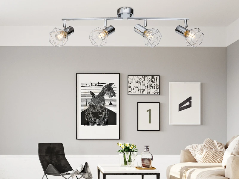Das besondere Erscheinungsbild des Deckenstrahlers entsteht durch den vier verchromten Gitterlampenschirmen die den Blick auf die Filament LED Leuchtmittel freigeben.