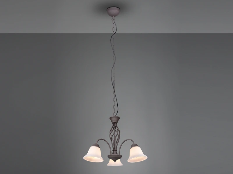 Rustikale Metallelemente treffen auf stilvoll geschwungene Glasschirme, die in Kombination ein besonderes Ambiente schaffen. Die angenehme Rostoptik unterstreicht das rustikale Design der Leuchte, die sich vorzugsweise in klassischen Einrichtungsstilen wiederfindet oder bei modernen Wohnkonzepten für einen spannenden Stilbruch sorgt.