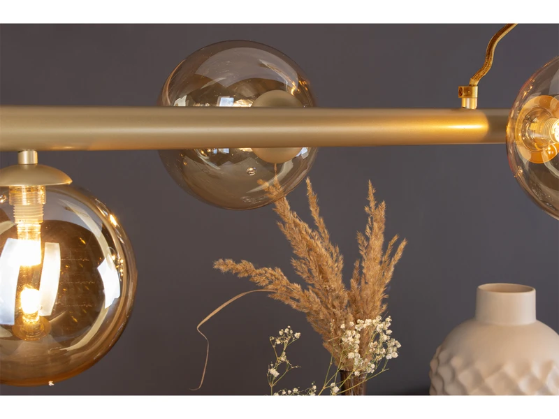 Das Retro Design ist ein Mix aus edler Metall-Optik in Messing & 6 Rauchglas Kugeln in Amber. Durch die runde Form scheint das Licht nach oben und unten und erzeugt ein wirkungsvolles Lichtspiel an den Wänden.