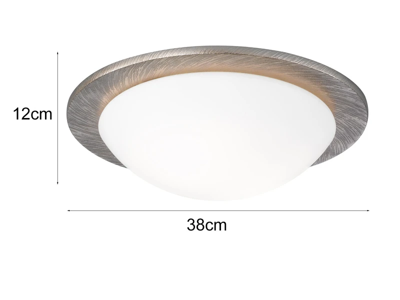 Die Deckenlampe hat einen Gesamtdurchmesser von 38cm und eine Höhe von 12cm. Sie ist mit zwei E27 Fassungen ausgestattet und wird inklusive austauschbarer LED Leuchtmittel mit einer Leistung von jeweils 9 Watt und 806 Lumen in Warmweiß geliefert. Diese sind mit einer sogenannten Switch-Dimmer Funktion ausgestattet und über Ihren vorhandenen Lichtschalter in 3 Stufen (100% – 50% – 25%) dimmbar.