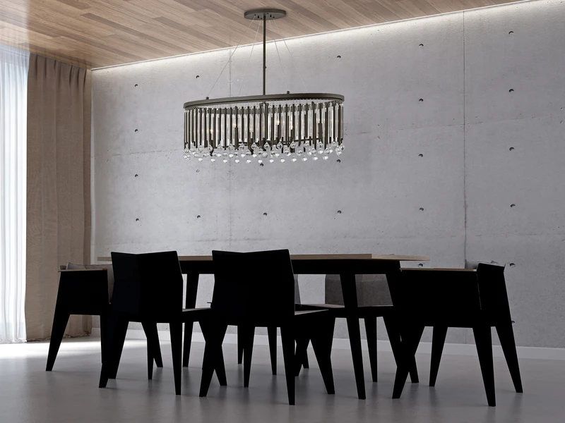 Der große ovale Lampenschirm ist bestückt mit Echtglaselementen, die für faszinierende Lichtspiele sorgen. Das solide Metallgestell ist in Espressofarben lackiert und rundet das luxuriöse Erscheinungsbild dieser Designerleuchte ab, die ein absoluter Eyecatcher in jedem Innenbereich ist. Zudem kann der Lüster in der Höhe von 42cm bis 134cm eingestellt werden.