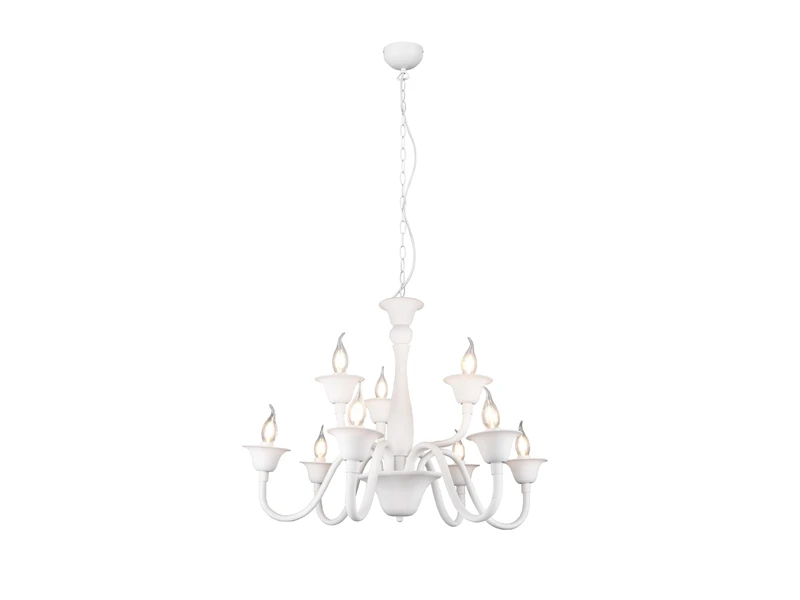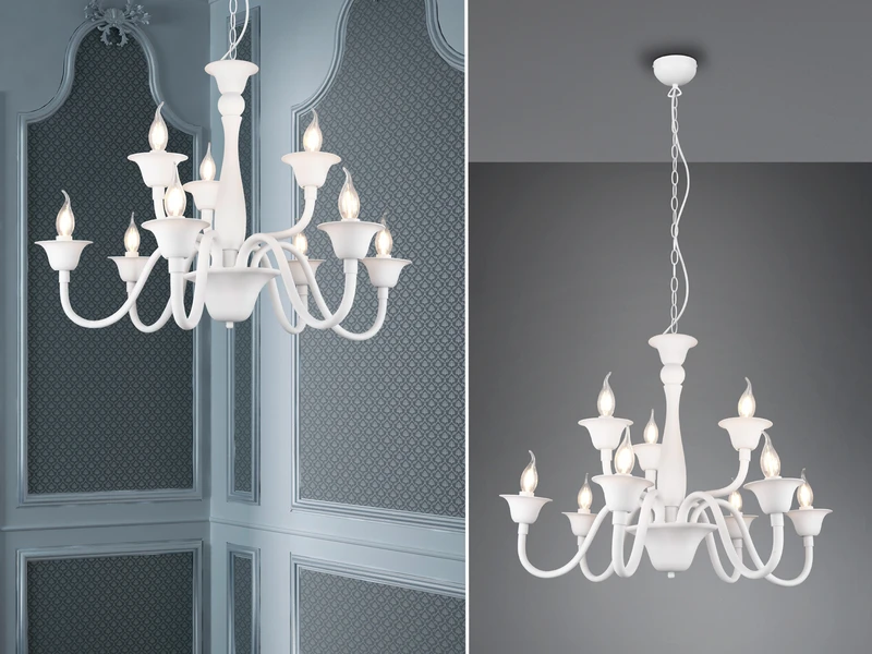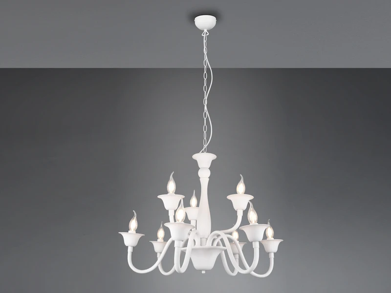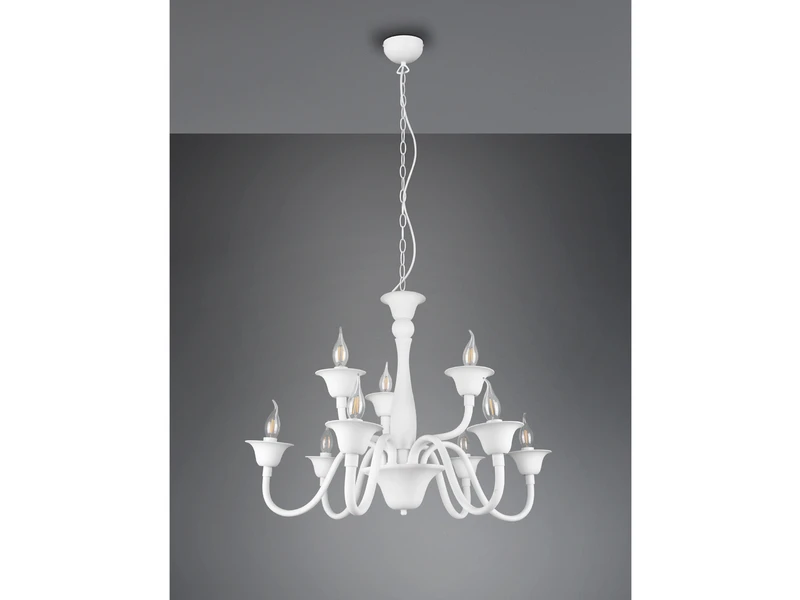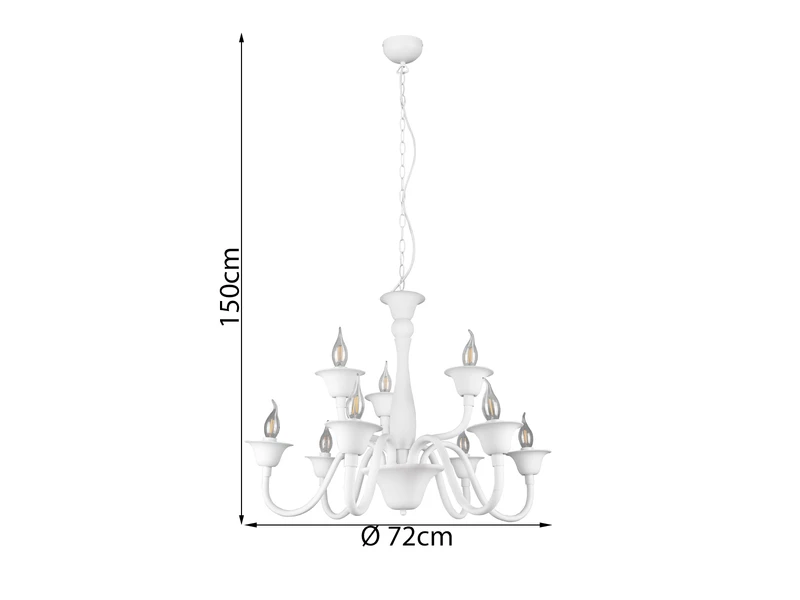Der Kronleuchter hat einen Durchmesser von 72cm und eine maximale Höhe von 150cm. Die weiß matte Gestaltung unterstützt das Design der Leuchte und lässt sich gut mit vorhandenem Interieur kombinieren.