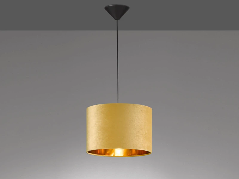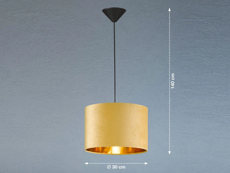 Das besondere Erscheinungsbild der einflammigen Hängeleuchte entsteht durch den gelben Lampenschirm aus Samt mit goldfarbener Innenfläche, der mit einem Durchmesser von 30 cm für eine angenehme Lichtstimmung sorgt.