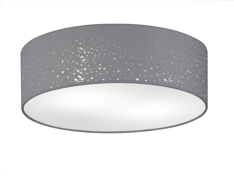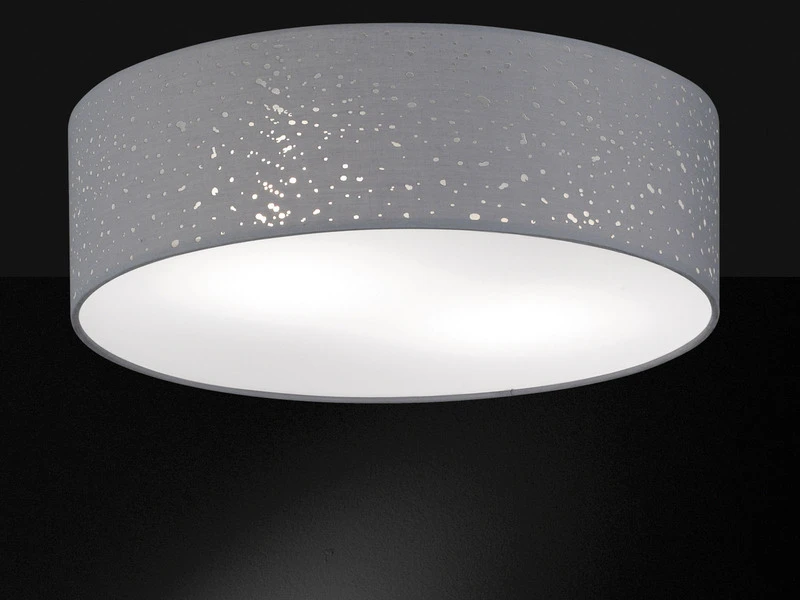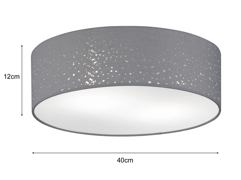 Der graue Stoffschirm mit stilvollem Dekor hat einen Durchmesser von 40 cm und eine Höhe von 12 cm. Das edle Erscheinungsbild der Deckenleuchte sorgt im Zusammenspiel mit der unteren, satinierten Acrylabdeckung für ein harmonisches Ambiente.
