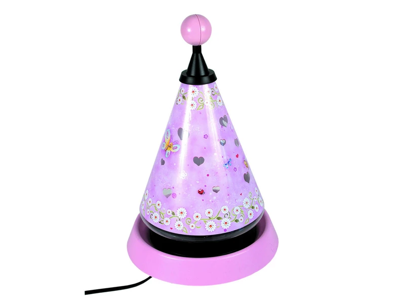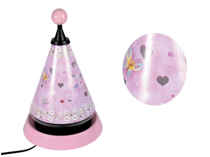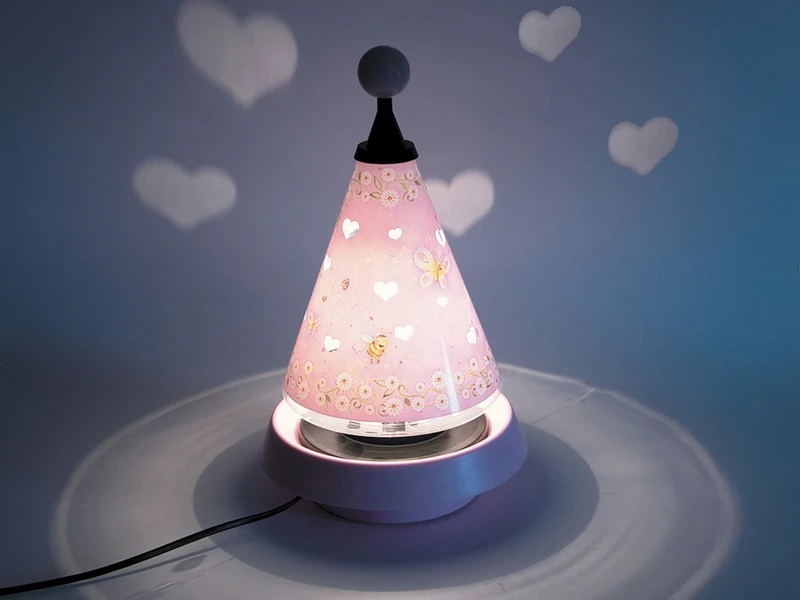 Am Abend sorgt die Tischlampe für eine entspannte Einschlafatmosphäre im Kinderzimmer. Beim Einschalten der Leuchte dreht sich der Kegel und projiziert unendlich viele Herzen in den Raum, die das ganze Zimmer in eine zauberhafte, sich langsam bewegende Traumlandschaft verwandeln.