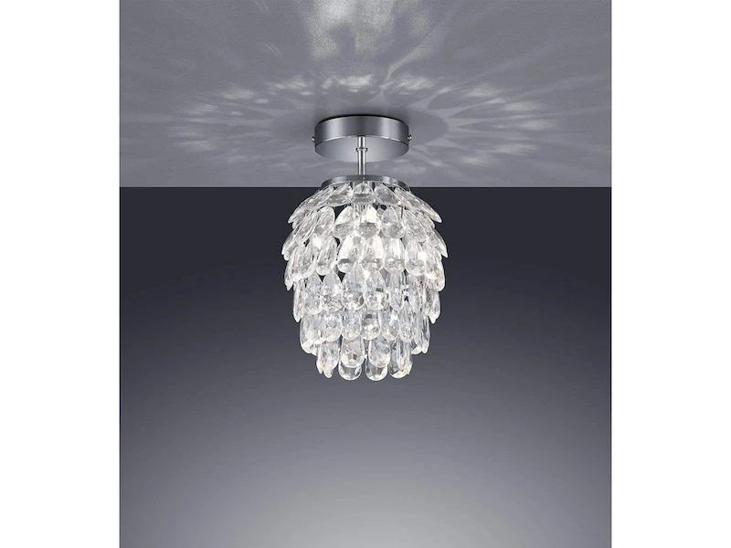 Die extravagante Leuchte besteht aus glitzernden Kunststoffanhängern in denen sich wunderbar das Licht bricht und so faszinierende Schatten wirft. Die Deckenlampe ist aus chromfarbigem Metall designt. Die glitzernden Acrylsteine verleihen der Leuchte einen glamourösen Stil und funkeln durch das Licht in der Mitte.