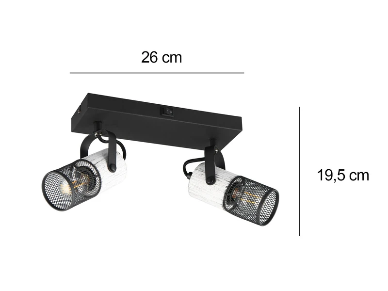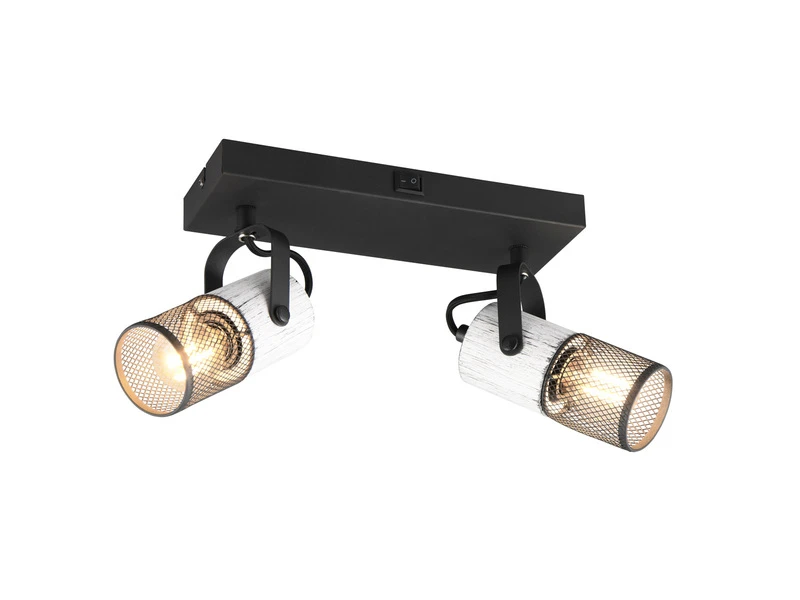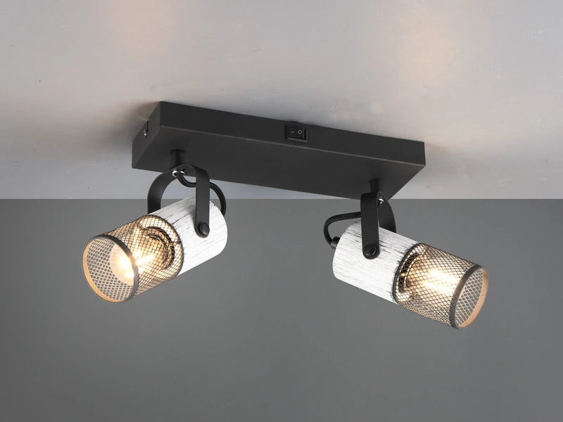 Die dreh-und schwenkbare Spots der Wandleuchte bestehen aus schwarzem Drahtgeflecht und Holz in weiß antik, dass der Leuchte ihren Vintage Look verleiht.