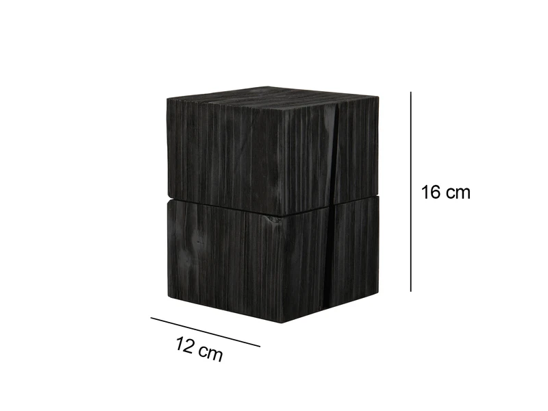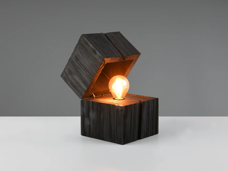 Komplett aus Holz in der Farbgebung Schwarz gefertigt und in cooler Würfeloptik ist die Tischlampe ein tolles Beleuchtungsaccessoire für nahezu jedes Interieur.