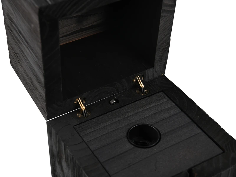 Der aufklappbare Holzwürfel verbirgt im geschlossenen Zustand das austauschbare E14 LED Leuchtmittel, dass sich über einen Kontakt einschaltet, sobald der Deckel hochgeklappt wird.