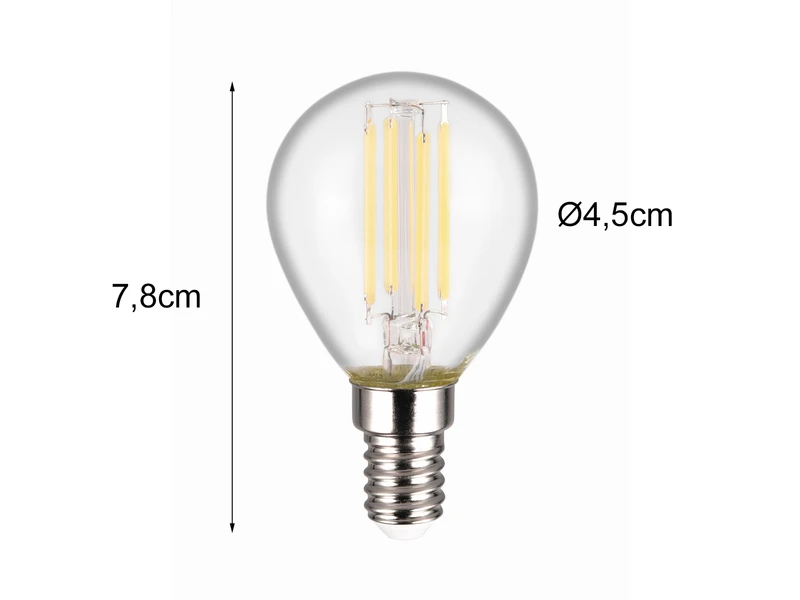 Dieses Filament LED in Tropfenform hat eine Leistung von 4 Watt, 500 Lumen, und verbreitet mit 4000 Kelvin ein neutralweißes Licht. Mit seiner langen Lebensdauer ist es um ein vielfaches sparsamer als ein herkömmliches Leuchtmittel.