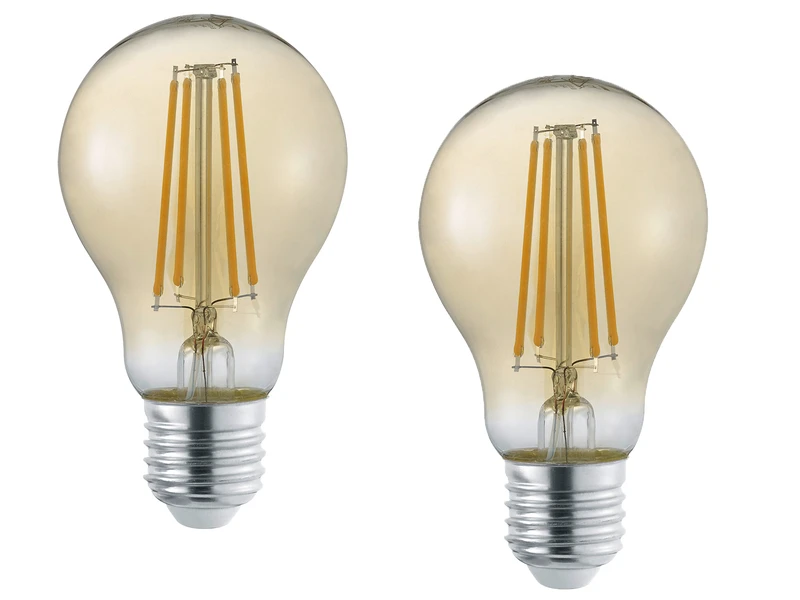 Dieses amberfarbene 2er SET Filament LED in Tropfenform hat eine Leistung von je 4 Watt, 470 Lumen, und verbreitet mit 3000 Kelvin ein warmweißes Licht. Mit seiner langen Lebensdauer ist es um ein vielfaches sparsamer als ein herkömmliches Leuchtmittel.