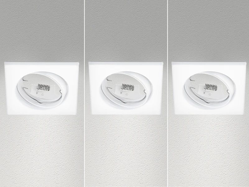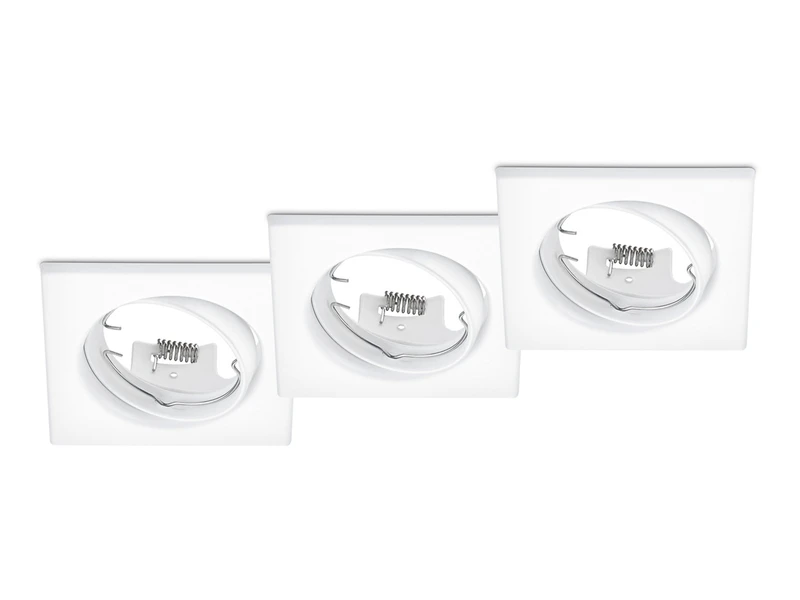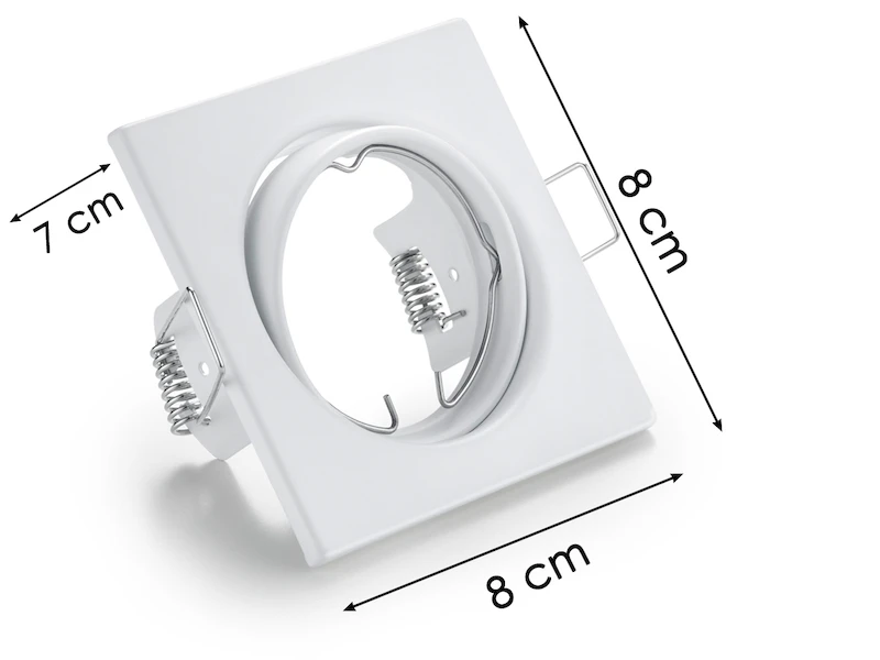 Gefertigt sind die Deckenlampen aus Weiß mattem Metall. Der eckige Spot hat eine Größe von 8 x 8 cm sowie eine Einbautiefe von 9 cm und lässt sich individuell ausrichten. Jede Einbaulampe ist mit einer GU10 Fassung ausgestattet und für ein Leuchtmittel bis max 15 Watt geeignet.