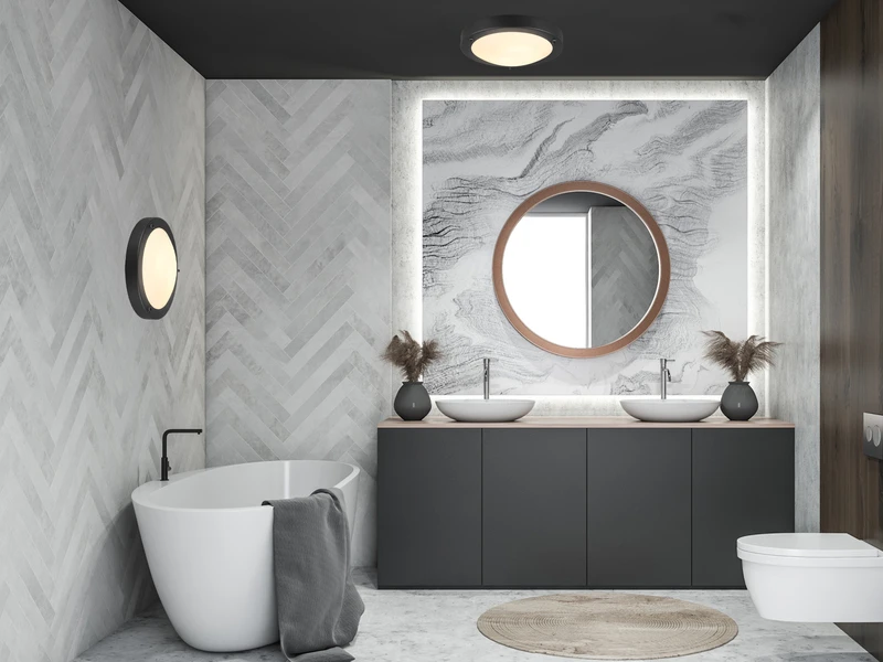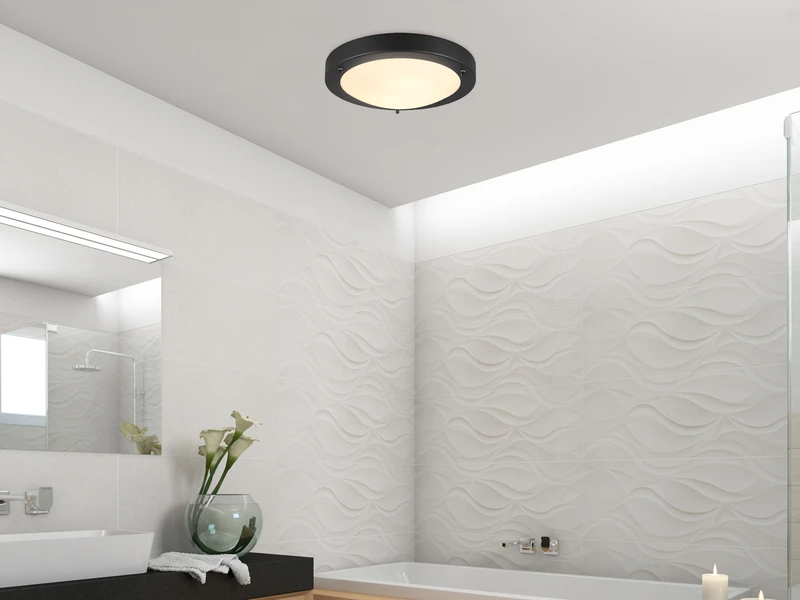 Dank Schutzart IP44 ist die Lampe gegen Spritzwasser geschützt und damit perfekt für alle Feuchträume, wie Badezimmer und Gäste WC geeignet. Die Kombination aus Metall in Schwarz matt und Weiß mattem Glas passt in jeden Wohnbereich. Dabei hat die Lampe einen Durchmesser von 31,5 cm sowie eine Höhe von nur 8 cm.