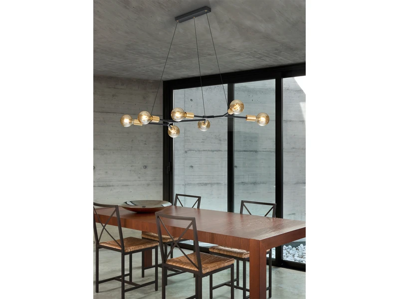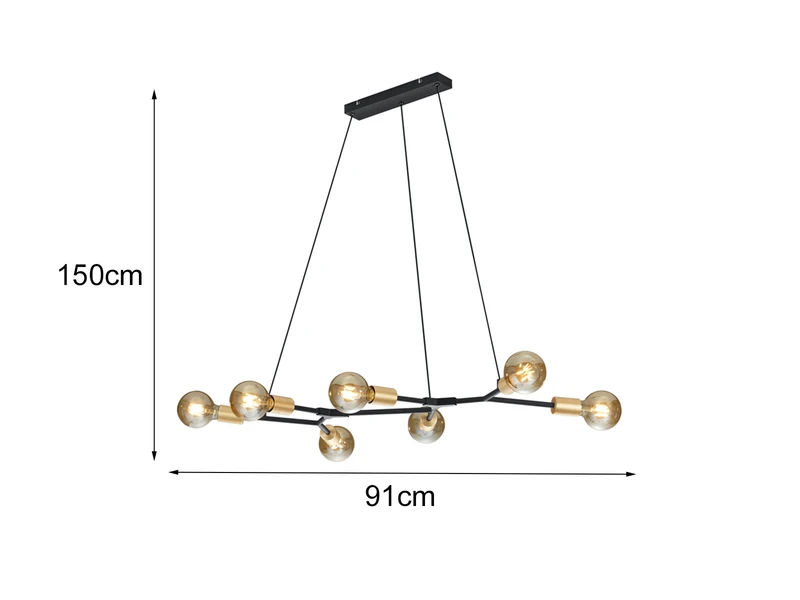Die 7-flammige Leuchte hat eine Abhängelänge von max. 150cm und ist 91cm breit. Die sieben E27-Fassungen können mit Leuchtmitteln bestückt werden, die eine Leistung von 28W nicht überschreiten. Da man einen direkten Einblick auf die Leuchtmittel hat und diese nicht von einem Leuchtenschirm verdeckt werden, empfehlen wir ein Filament Leuchtmittel zu verwenden. Dies lässt es harmonisch erscheinen und vervollständigt das Gesamtbild der Hängeleuchte, und lässt sie schnell zum neuen Eyecatcher in Ihrem Zuhause werden.