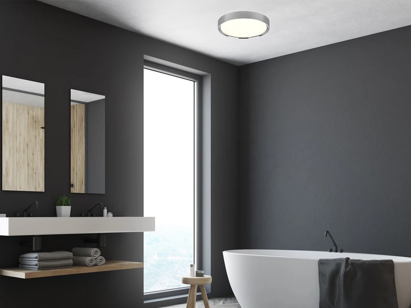 Dank Schutzart IP44 ist die Lampe gegen Spritzwasser geschützt und damit perfekt für alle Feuchträume, wie Badezimmer und Gäste WC geeignet. Die edle Optik in Silber Chrom und Weiß, unterstreicht den minimalistischen Einrichtungsstil und sorgt für ein helles, freundliches Ambiente. Dabei hat die Lampe einen Durchmesser von 33 cm sowie eine Höhe von nur 9 cm.
