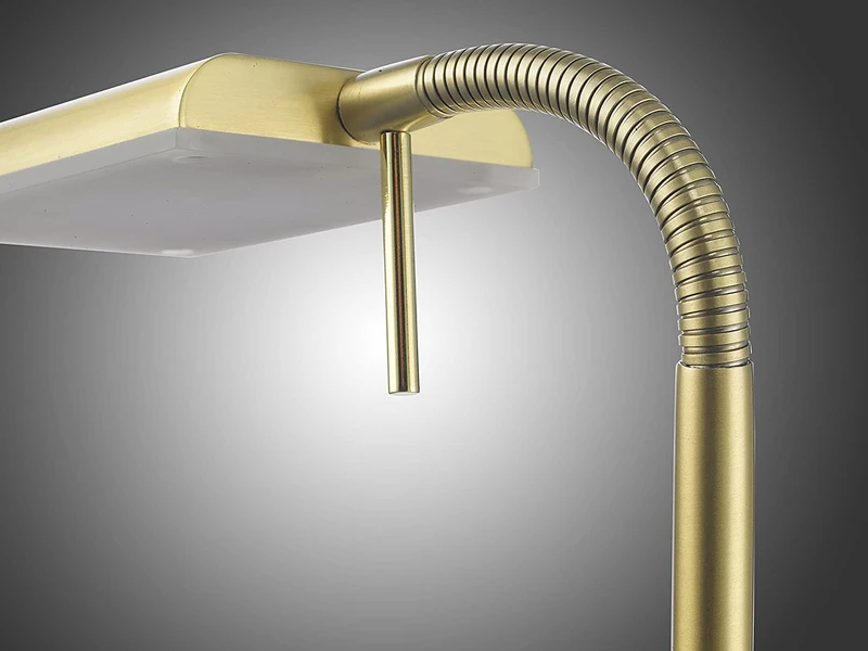 Über einen Sensordimmer kann zusätzlich die Helligkeit der Leuchte reguliert werden, und Dank integrierter Memory Funktion wird die Lichteinstellung beim Ausschalten der Leuchte gespeichert und beim erneuten einschalten wiedergegeben. Die Stehleuchte in Messing matt unterstützt ein modernes Erscheinungsbild und fügt sich problemlos in verschiedene Einrichtungsstile ein.