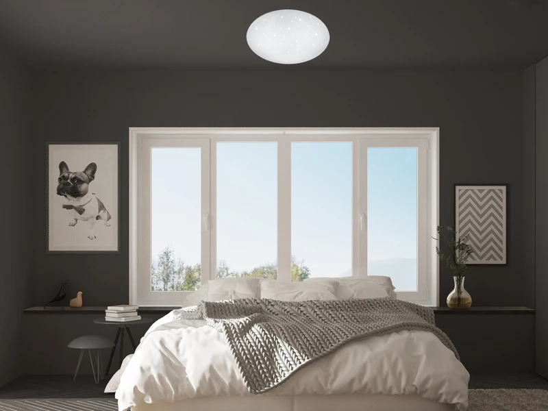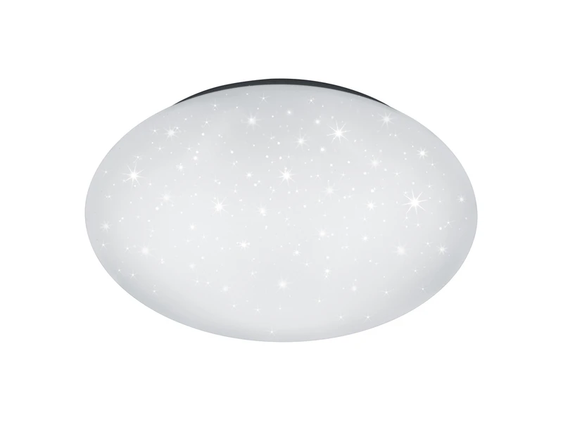 Die Deckenleuchte hat eine Höhe von 8,5 cm und einen Durchmesser von 37 cm. Dadurch kann die flache Lampe auch perfekt zur Wandbeleuchtung genutzt werden. Der weiße Lampenschirm sorgt für ein blendfreies, gleichmäßig helles Licht und komplettiert mit seinem Sterneffekt das harmonische Erscheinungsbild.