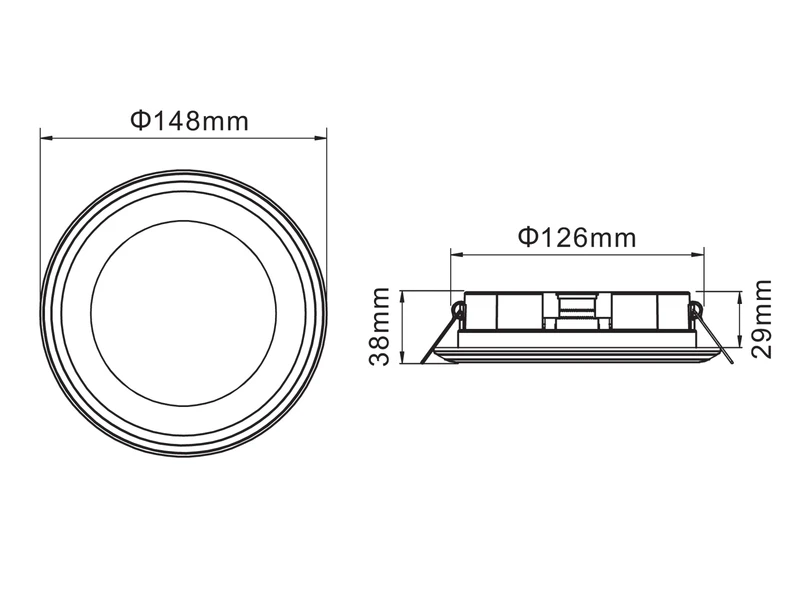 Jede Einbaulampe aus Kunststoff hat einen Durchmesser von 14,8 cm und eine Höhe von 3,8 cm. Für den Einbau wird ein 13 cm breiter Ausschnitt und eine Einbautiefe von min. 4 cm benötigt.