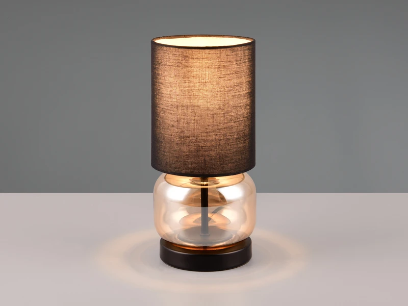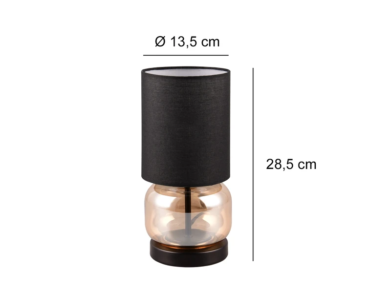 Der Leuchtenkorpus aus Metall in Schwarz matt wird von einem transparenten amberfarbigem Glaselement umgeben und macht die 28cm hohe Tischlampe zu einem echten Hingucker.